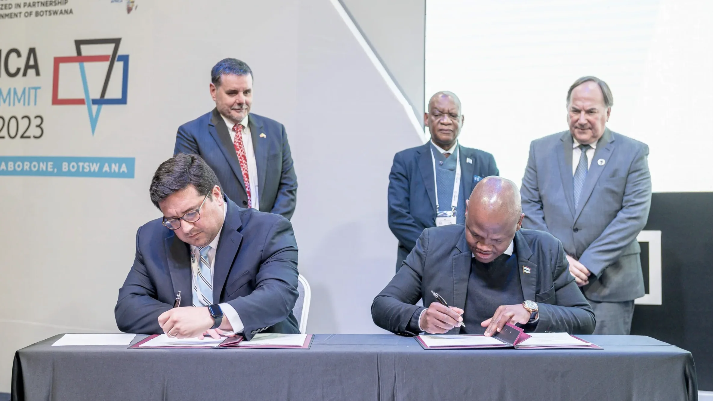 (L-R, seated) Chris Perez, Head of International for Ginkgo Biosecurity, and Dr. Edwin Dikoloti, Minister of Health of Botswana, sign the agreement for a pathogen monitoring program in Gaborone, Botswana on July 12. (Photo credit: Corporate Council on Africa)